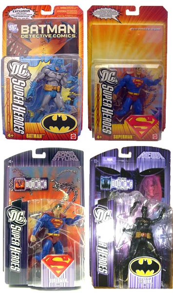 DC Superheroes Batman and Superman series in packages Left to right: Batman and Superman in orange (2006) package, and Superman and Batgirl in purple (2007) package